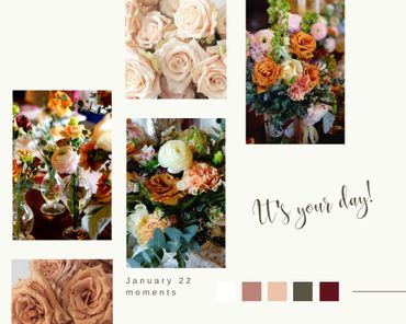 After your date is confirmed, I'll start working on a mood board. There may be several to choose from as this helps us both narrow down color choices, style, and personality. We may talk over the phone to get more specific. We do not need to meet at this point.